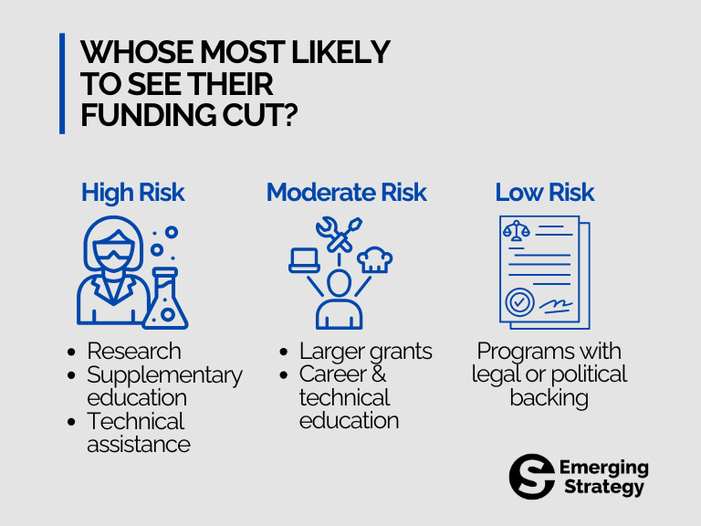 Federal Student Aid (FSA), educational research, and technical assistance programs emerge as key areas vulnerable to budget cuts. Programs with substantial federal oversight, such as Title I and Individuals with Disabilities Education Act (IDEA) grants, may face administrative downsizing or devolvement to state-level control.