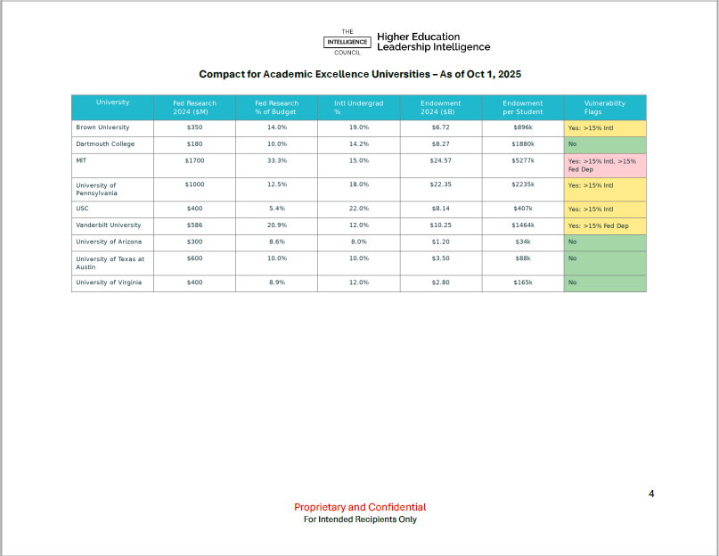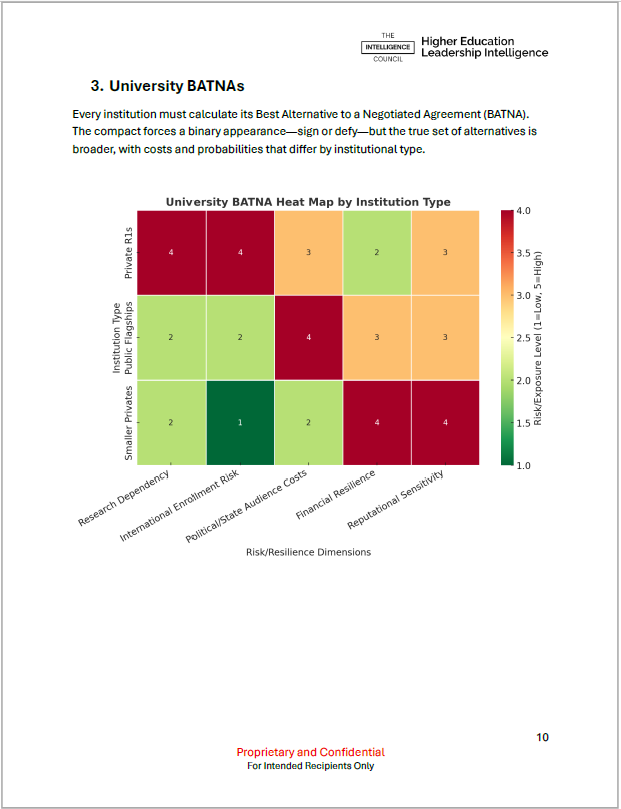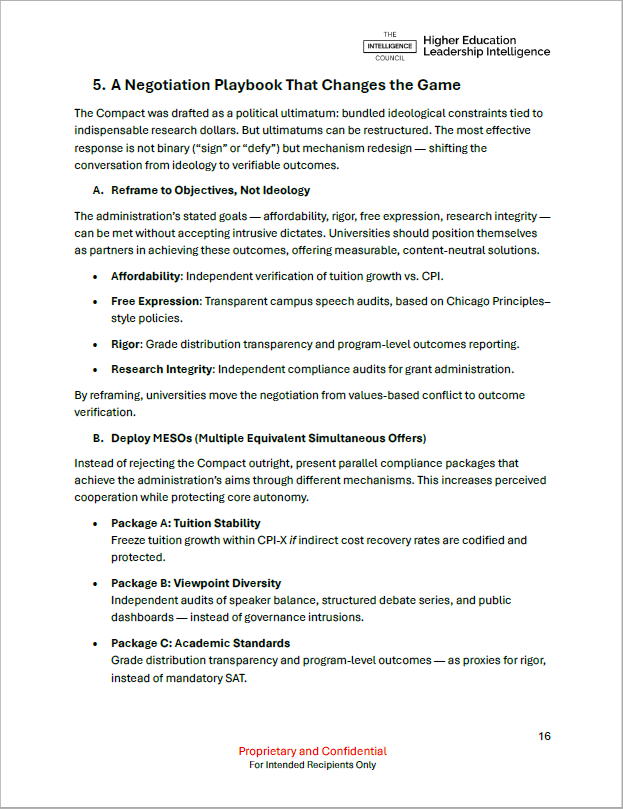 The Intelligence Council has applied the tools of game theory and advanced negotiation science from the Harvard Negotiation Project, international bargaining case studies, and mechanism design in economics, to the Compact now confronting higher education. The aim is not abstract modeling but to make the structure of the problem legible: who holds power, what levers exist, and how choices cascade when multiple actors move under public scrutiny. While the Compact was delivered yesterday to nine elite universities, it is clearly a prototype that will extend further. This analysis is therefore written not only for their presidents, provosts, trustees, and advisors, but also for institutional leaders across higher education who will soon face similar terms.