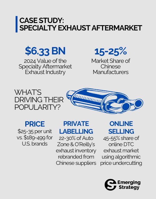 - Retailer Private Labels: 22–30% of AutoZone and O’Reilly’s exhaust inventory is now sourced from Chinese suppliers, rebranded under house labels.